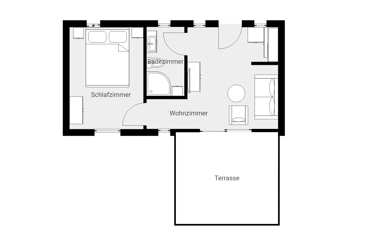 Diese Ferienwohnung ist ideal für ein Paar oder eine Familie mit einem Kind. Sie besteht aus einem Wohnbereich mit integrierter Küchenzeile, einem Schlafzimmer und einem Badezimmer.